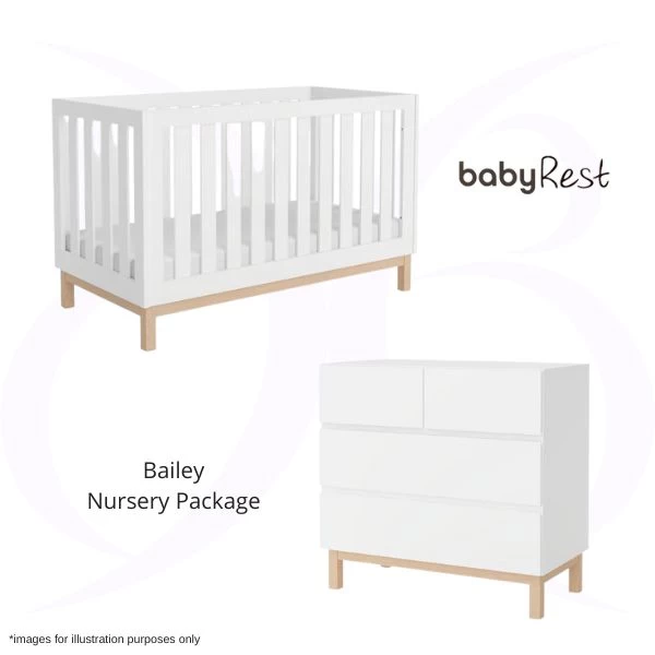 The BabyRest Bailey Nursery Package includes the Bailey Cot, Comficore Mattress & Bailey Chest.