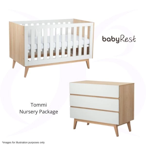 The BabyRest Tommi Nursery Package includes the Tommi Cot, Comficore Mattress & Tommi Chest.