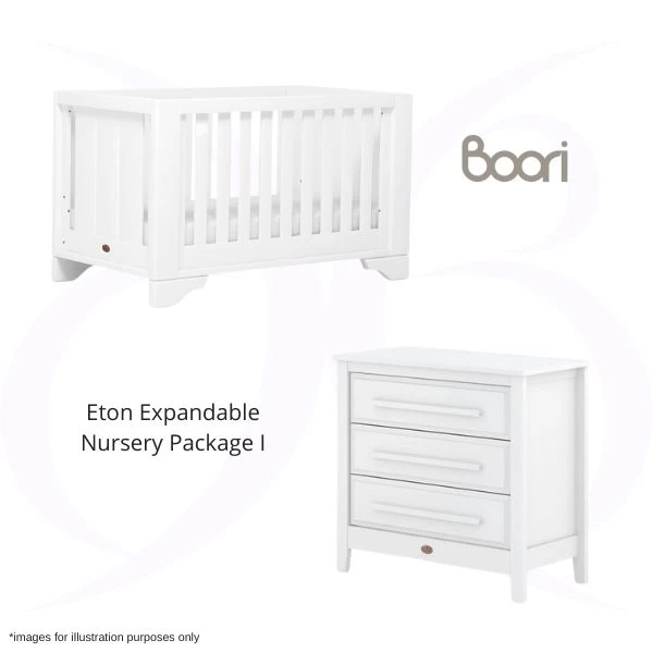 The Boori Eton Expandable Nursery Package includes the Boori Eton Expandable Cot, Pocket Spring Mattress, Linear 3 Draw Chest.