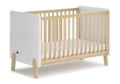 The Boori Natty Cot Bed offers a modern and functional cot bed with rounded corners, playful angled feet and a muted two-tone oak-effect finish.
