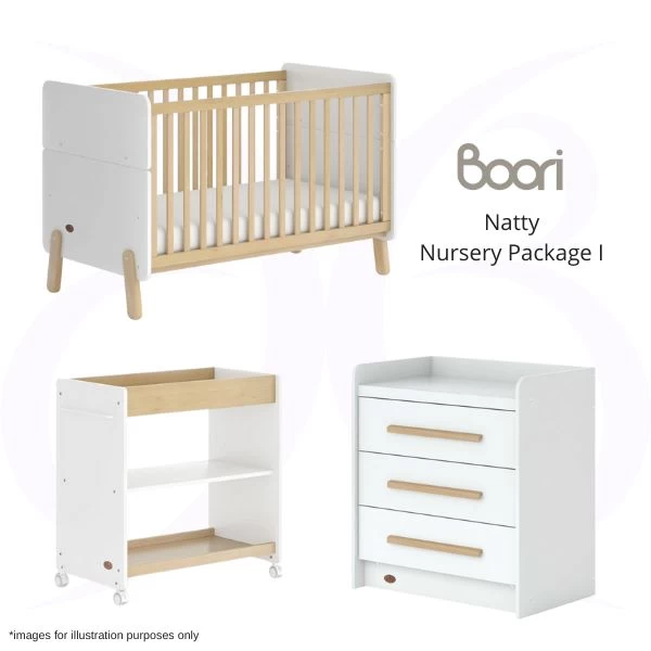 The Boori Natty Nursery Package II includes a Boori Natty Cot, Neat 3 Drawer Chest, Neat Changer and Boori Pocket Spring Mattress.