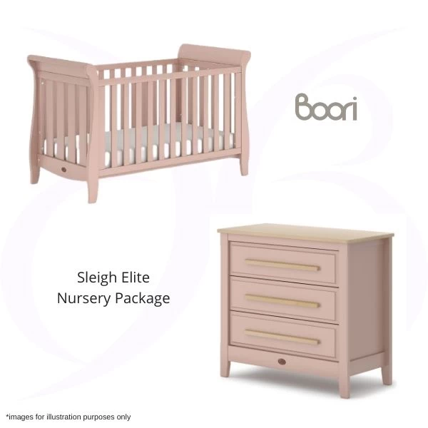 The Boori Sleigh Elite Nursery Package includes the Boori Sleigh Elite Cot, Pocket Spring Mattress & Linear Sleigh 3 Drawer Chest.