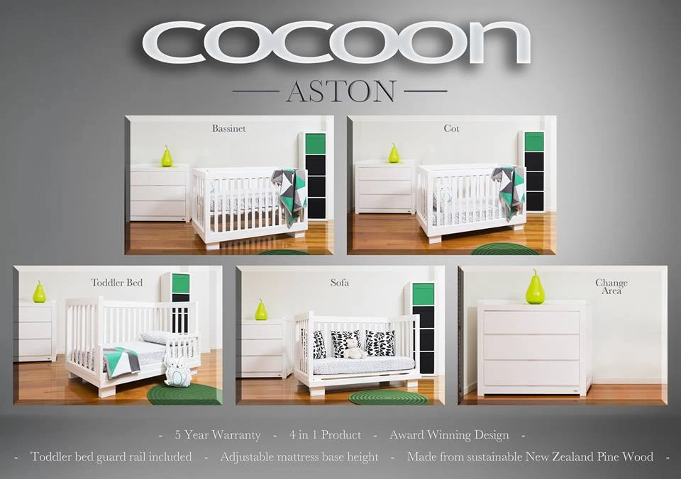The Cocoon Aston Cot + Mattress is unique in every way. It has been designed with innovation and a contemporary perspective in mind, and the result is a stunning item of furniture which can convert into a toddler bed & sofa as your child grows.