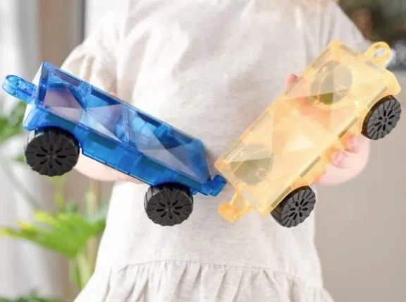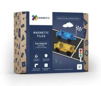 Connetix 2 Piece Car Pack includes one blue and one yellow car motion base featuring REAL rubber wheels and our unique bevel design.