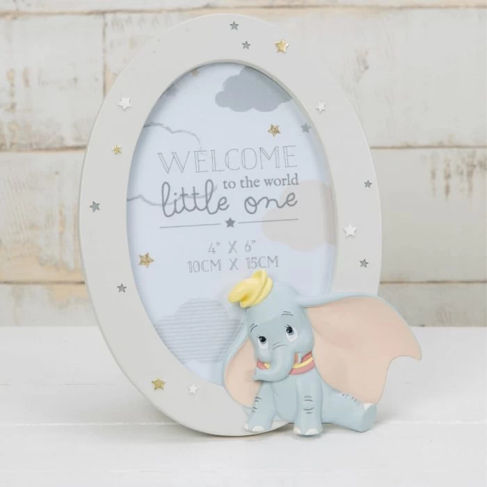 The Disney Dumbo Round Photo Frame has been painted in gender neutral colours and decorated with gold, grey and white stars. It features a round frame, suitable for a 4″ x 6” photo of your little one. This Disney photo frame would make a sweet addition to a nursery room.