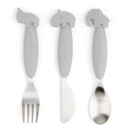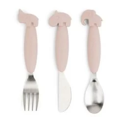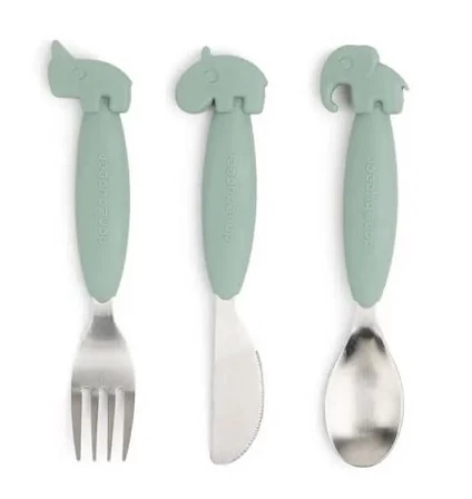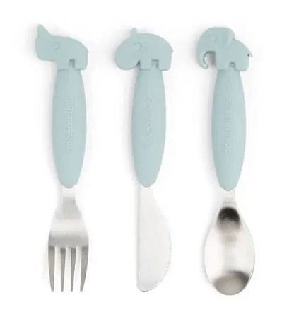 A fun and practical Done by Deer Easy-Grip Cutlery Set comes with a spoon, knife and fork for little eaters learning to eat on their own.