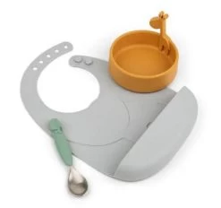 A wonderful gift set or a perfect starter feeding pack for your baby, this Peekaboo First Meal Set from Done by Deer includes a silicone bowl, spoon and bib.