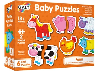 The Galt Baby Puzzles Farm Set of 6 shaped 2 piece puzzles for very young children. These simple colourful puzzles with chunky pieces will encourage early matching skills and manual dexterity.