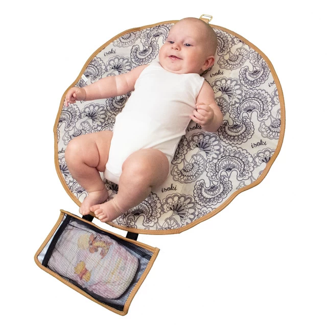 The Isoki Adelaide Round Change Mat Purse Two Tone reveals a super large round wipe clean mat keeping your baby clean and comfortable while you change nappies or giving you a safe space for them to have some tummy time.