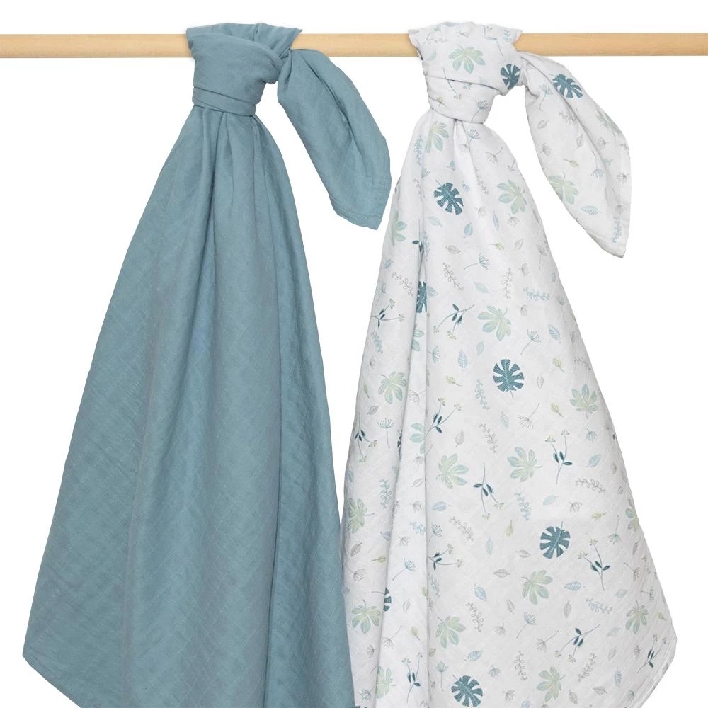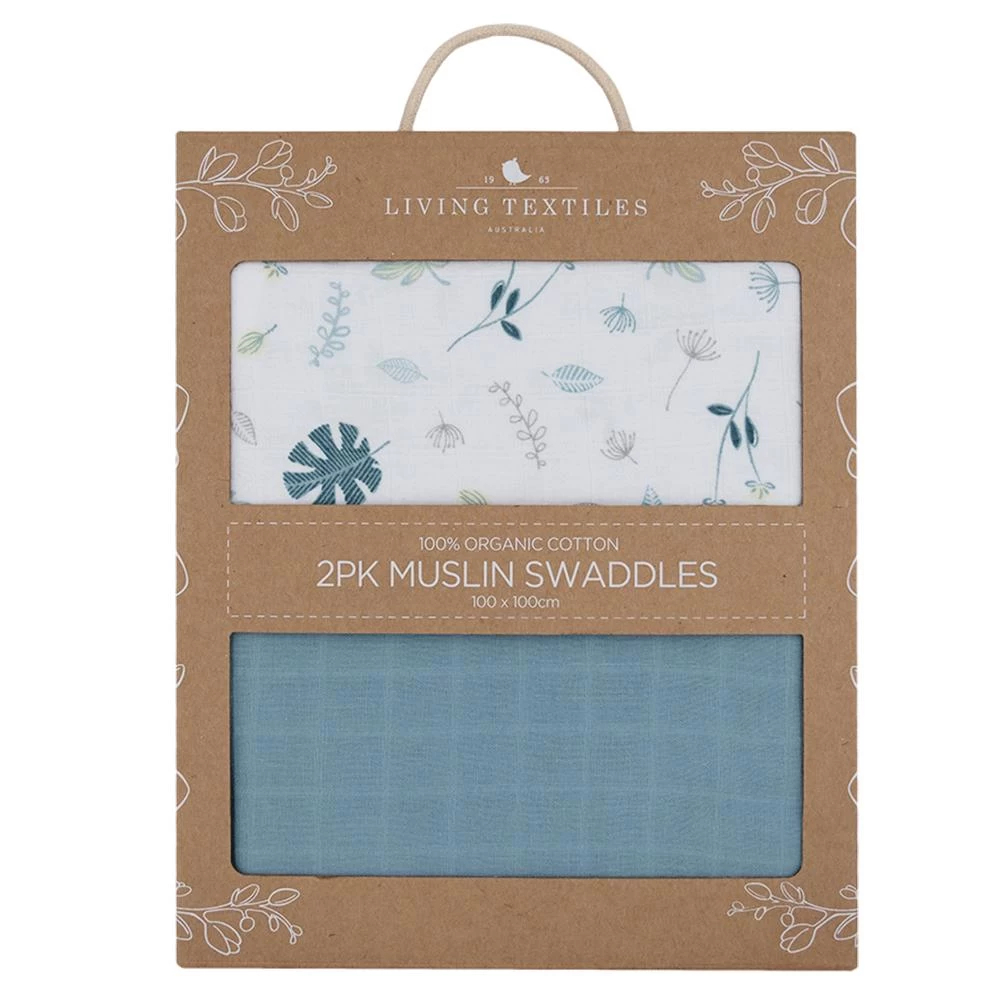 The Living Textiles Organic Muslin Swaddle 2pk Banana Leaf/Teal is generously sized at 100 x 100 cm, our muslin swaddle wraps are light weight and breathable, making them perfect for swaddling, as an extra layer in the pram/stroller or even as a breastfeeding cover.