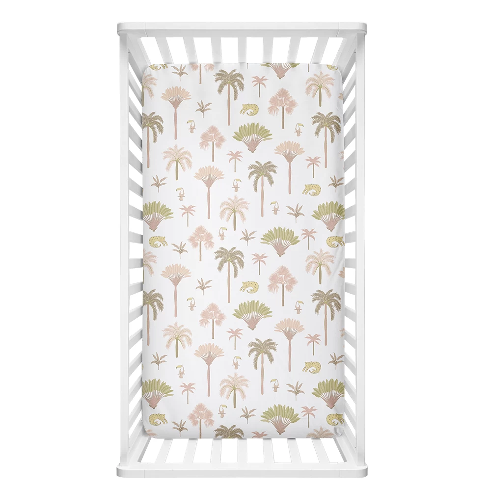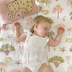 The gorgeous cot quilt features a fun tropical print with embroidery outline and a cotton sateen backing that lies smooth against your little one’s skin. Mix and match with one of two 100% cotton sateen cot fitted sheets in fun tropical or blush banana leaf prints, and when your toddler is ready, match with the reversible pillowcase.