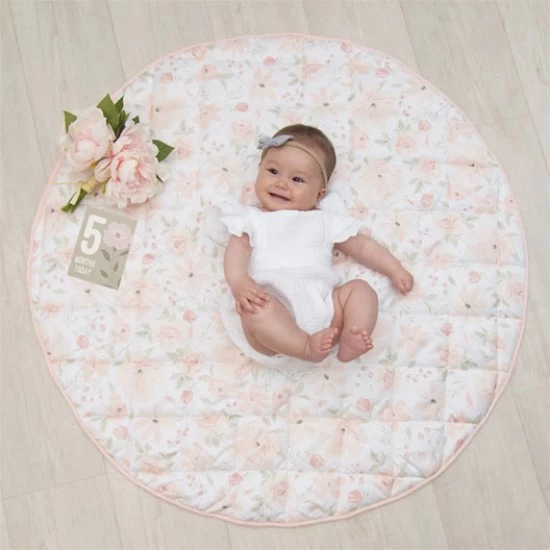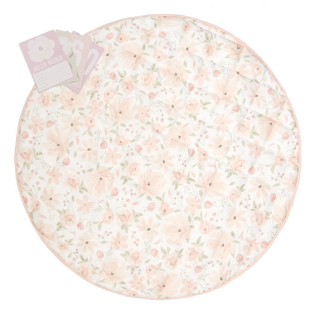 The Lolli Living Play Mat with Milestone Cards Meadow features a gorgeous blush floral on one side and a sweet watercolour on the reverse.