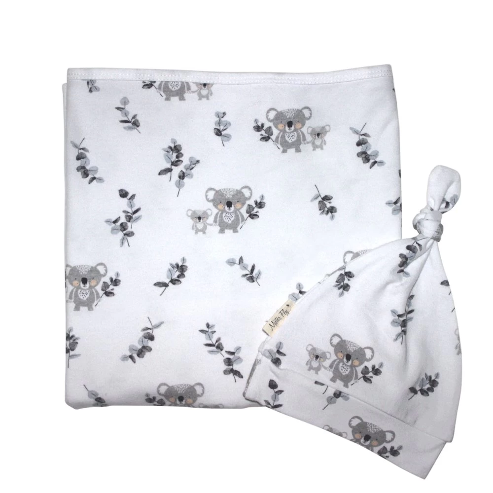 The Mister Fly Jersey Wrap and Beanie Set Koala Buddies is the perfect newborn gift.