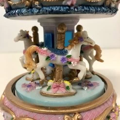 Simply wind the Musical Carousel 3 Horses Pink & Blue to hear music play and watch the fairy’s ride around on horses. It makes a beautiful keepsake.