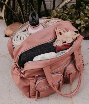 The OiOi Faux Leather Carry All Nappy Bag Dusty Rose is loved for its ingenious double compartments and soft touch textured durable material with water-resistant finish.