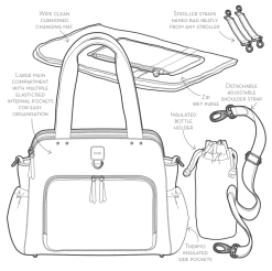 Large padded microfibre change mat (wipe clean or gentle machine wash) Insulated bottle holder with up to 2 hours insulation (maximum bottle size 330 ml) Transparent zip top purse (great for medicines!) 2 x Stroller Straps that hang your bag neatly from any stroller Detachable messenger strap