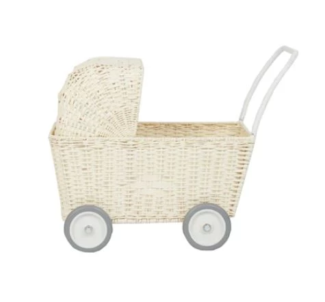 Meet Strolley, a revolutionary design in imaginative play. This hand-woven rattan basket on wheels switches from a pram to a shopping trolley, by just lowering the hood of the pram.