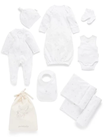 Our eight piece set comes in a lovely calico bag making the ideal newborn gift. Clothing size 0000 (newborn).