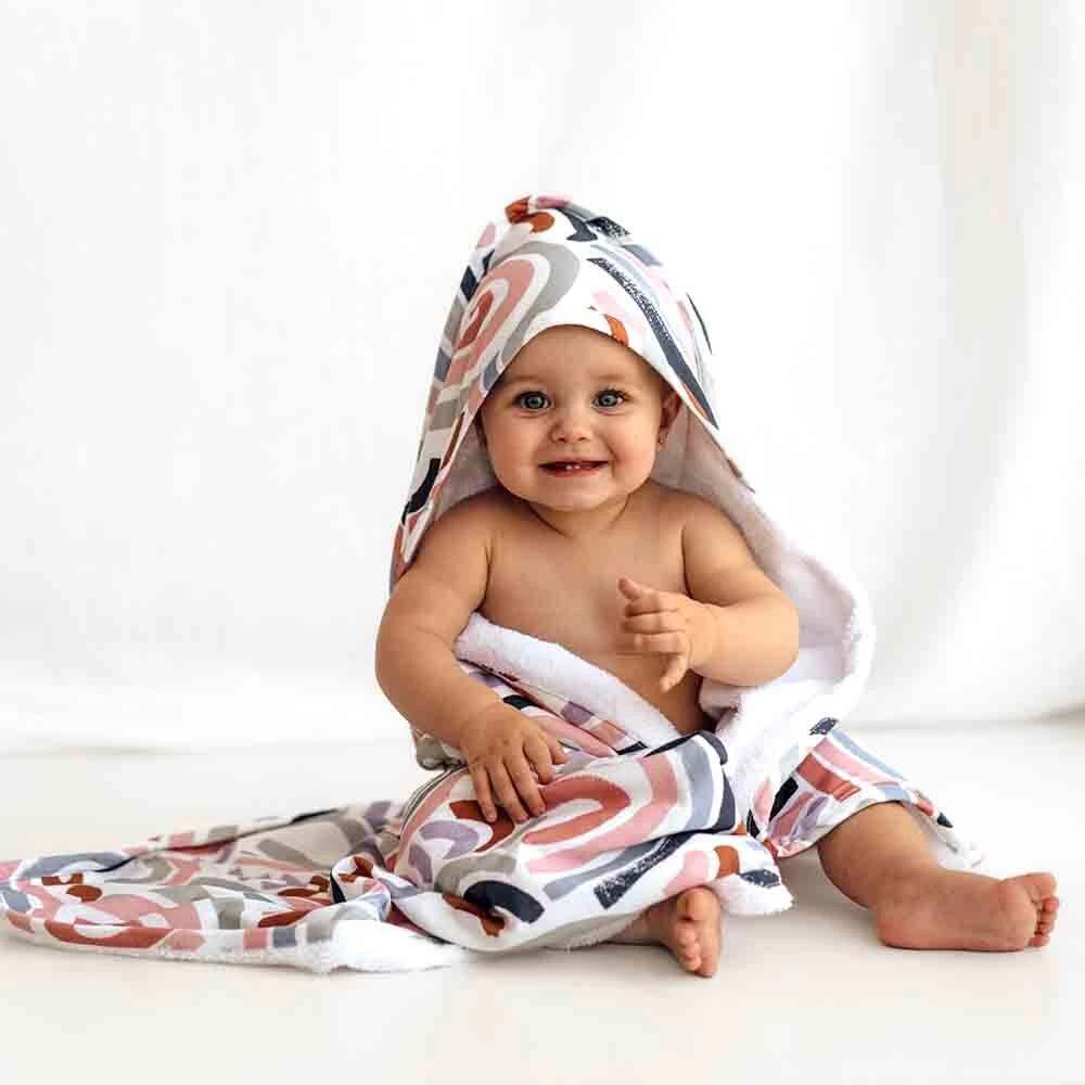 The Snuggle Hunny Organic Hooded Baby Towel Rainbow Baby features jersey organic cotton on one side and organic terry towelling on the other side. The towel is an extra large 90cm x 90cm so ideal for babies through to toddlers.