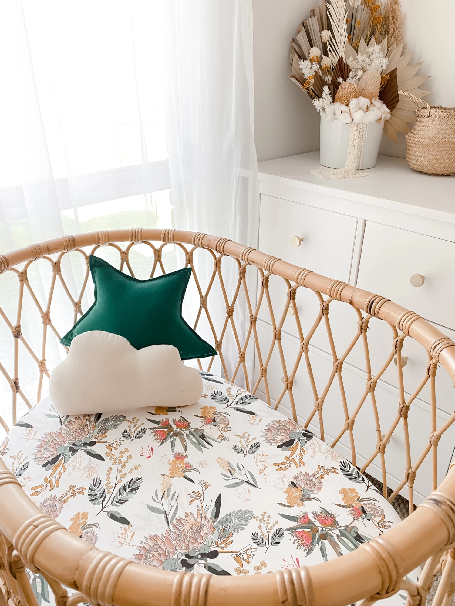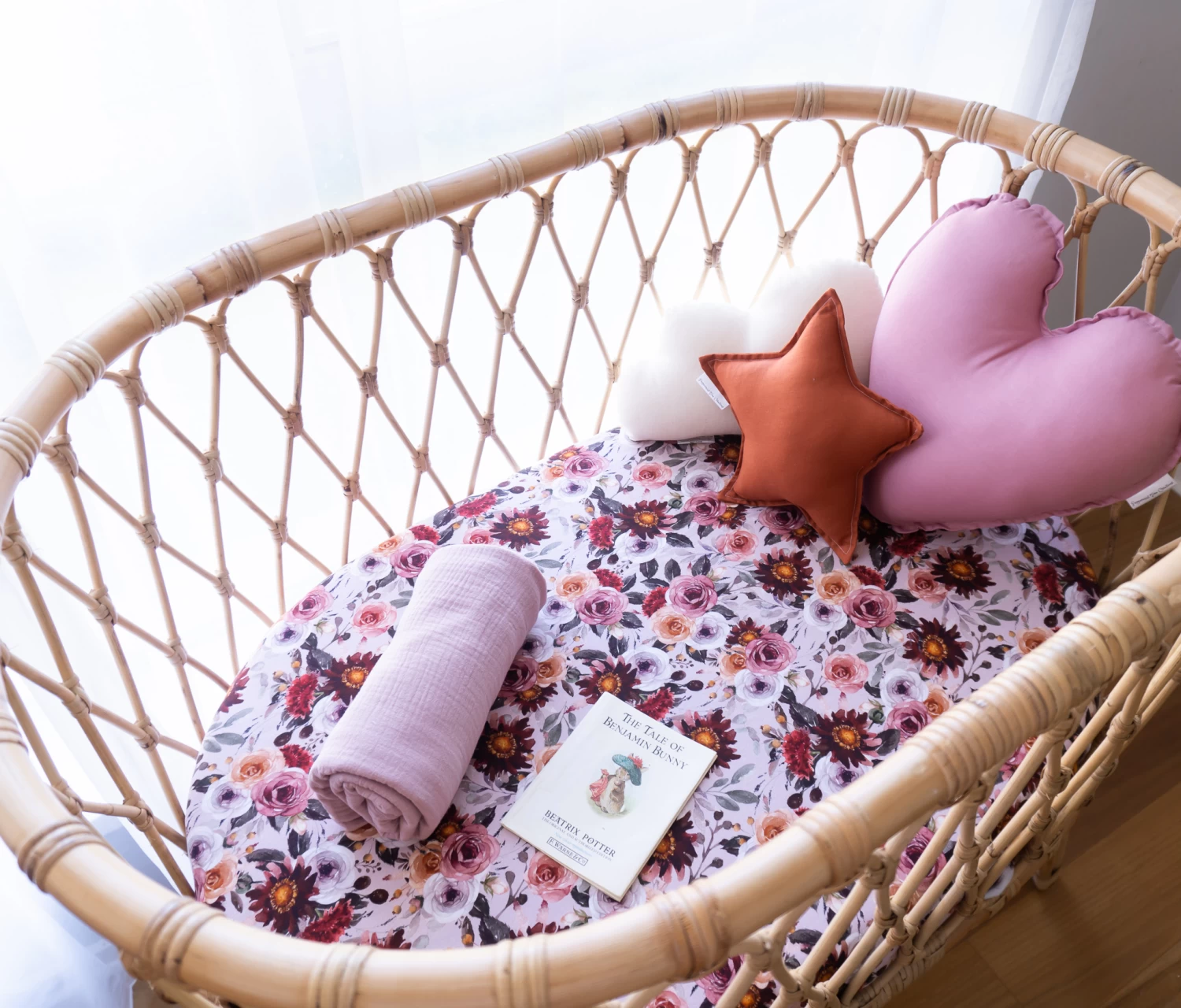The Snuggly Jacks Fitted Bassinet Sheet Blithe Floral is multi purpose and fits perfectly as a change mat cover or on your round or rectangle bassinet.