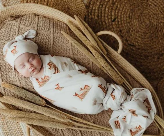 The Snuggly Jacks Jersey Wrap & Beanie Set Fawn is perfect for getting a nice tight swaddle, while still being breathable, so your babe wont get all sweaty! Wonderful as a go anywhere blanket. Fitting easily in the nappy bag, beautifully light and great to use as a cuddle blanket long past the necessary swaddle time.