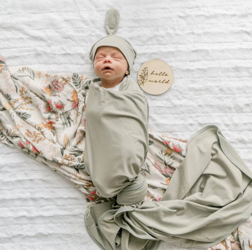 Made from 95% cotton and 5% Spandex our organic swaddle wraps have the prefect amount of stretch to keep your babies snug during sleep time. Our Wraps measure 100cm x 100cm and come with a matching Beanie or headband to add that special little touch.