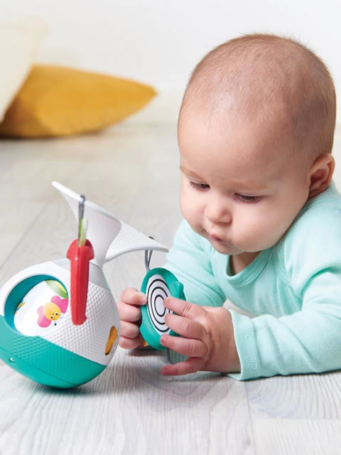 Set the entertainer on tapping mode and let baby try and prompt the fun audio and visual feedback by tapping the toy while in tummy time. This will encourage baby to reach out and try over and over again, strengthening important muscles.