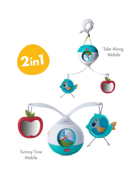 Place mobile at the appropriate distance from baby (around 25cm away) and let them enjoy the engaging sound and movement while in tummy time, helping them gradually stay in the position a little longer. When you leave the house, take the mobile along so baby can enjoy the comfort of a familiar toy.