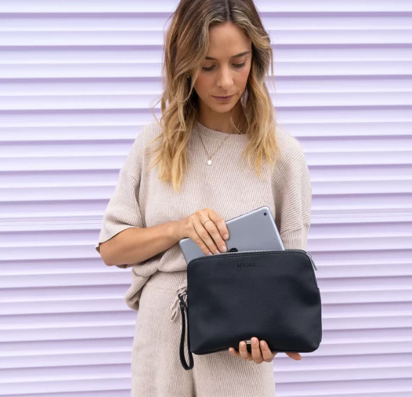 The Vanchi Everything Pouch Tan features 3 internal pockets including a zippered privacy pocket, the Everything Pouch is surprisingly spacious. It comes with a wristlet that you can hang from a pram or bag, and you can add matching wipeable vegan leather activity mat that fits perfectly inside.