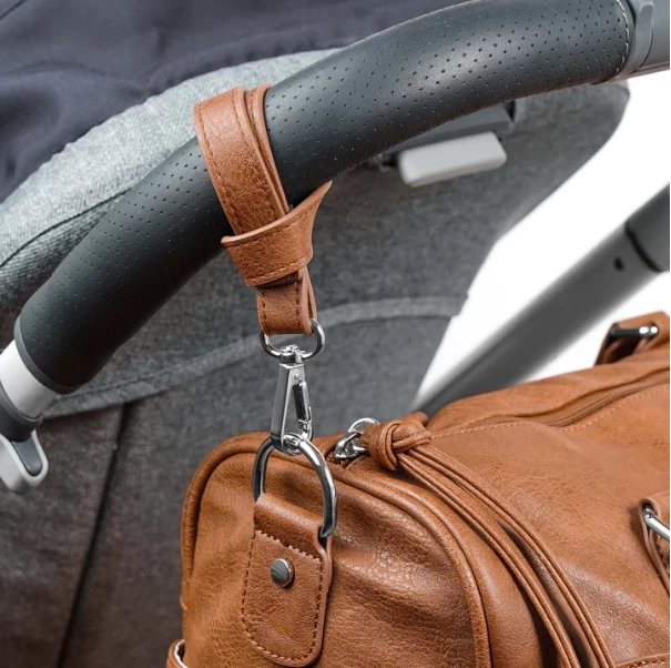 The Vanchi Pram Caddy/Bag Clips Tan offer parents chic on-the-go convenience, our new 100% Vegan Leather pram caddy/bag clips are styled to impress.