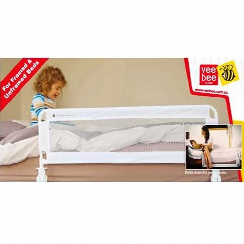 This revolutionary Vee Bee Fold Down Bed Guard provides peace of mind, while maintaining accessibility for bed-time stories and bed-changing without removal. Featuring an extra large panel and a sturdy powder coated frame, the Vee Bee Fold Down Bed Guard will fit framed and unframed beds and beds with spring bound bases.